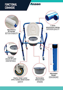 Anzen aluminium folding commode is adult potty chair designed to provide stability, comfort, thus lowering your risk of falling and re-injuring yourself. A commode makes it easier for caretakers to effectively care for patients without having to transfer their patient all the way to the bathroom. Designed with noise-free wheels to make transferring effortless.