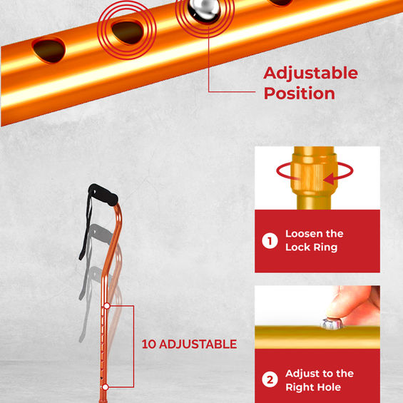 The BMate Aluminum Quad Cane provides a customized fit with 10 adjustable height positions. This allows users to achieve optimal comfort and support, ensuring proper posture and maximizing balance