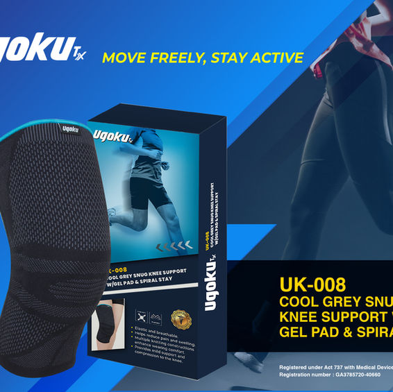 Crafted with precision using state-of-the-art German machines and knitting technology, the Cool Grey Snug Knee Support (Model: UA-008) ensures superior durability and resilience, standing up to regular use without easy deformation.