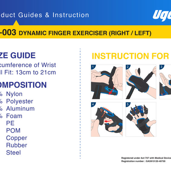 Ugoku Dynamic Finger Exerciser helps to enhance strength of fingers. It is used for patients with hemiplegia, post operation or with radial nerve palsy. It is equipped with a hand shaped plate, fingers cover, adjustable straps and soft foam padding for maximum wearing comfort.